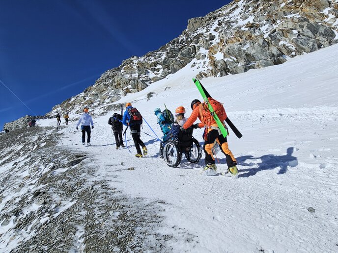 S pomočjo srčnih prostovoljcev, ki so jih spremljali in jim pomagali potiskati vozičke preko ledenika, so se povzpeli vse do 3.900 metrov visoko. Pred tem so na vozičke namestili smuči, kar je bila prava inovacija! Tudi ekipa iz našega Športnega društva Preddvor je spremljala in skrbela za njihovo varno smuko do postaje kabinske žičnice na nadmorski višini 3.883 metrov. Pred nami se je razprostirala čudovita pokrajina, ki je vzbujala občutek svobode in pustolovščine, hkrati pa smo se zavedali, kako pomembno je imeti ob sebi podporo in ekipo, ki poskrbi, da je vsak trenutek varen in poln užitka.